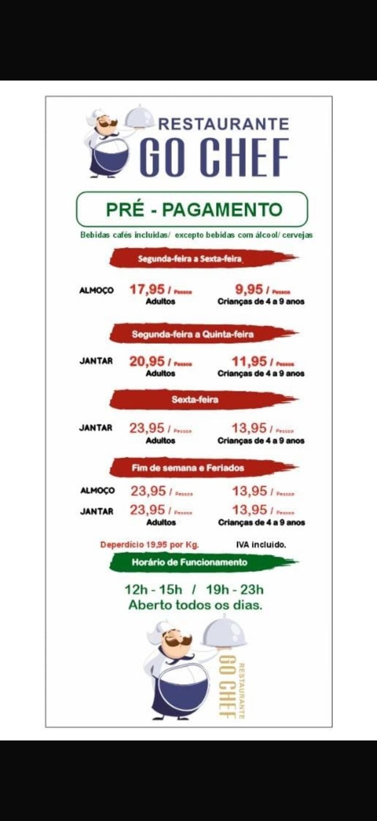 Preço por adulto 29.95euros / crianças 4-9 anos 14.95euros